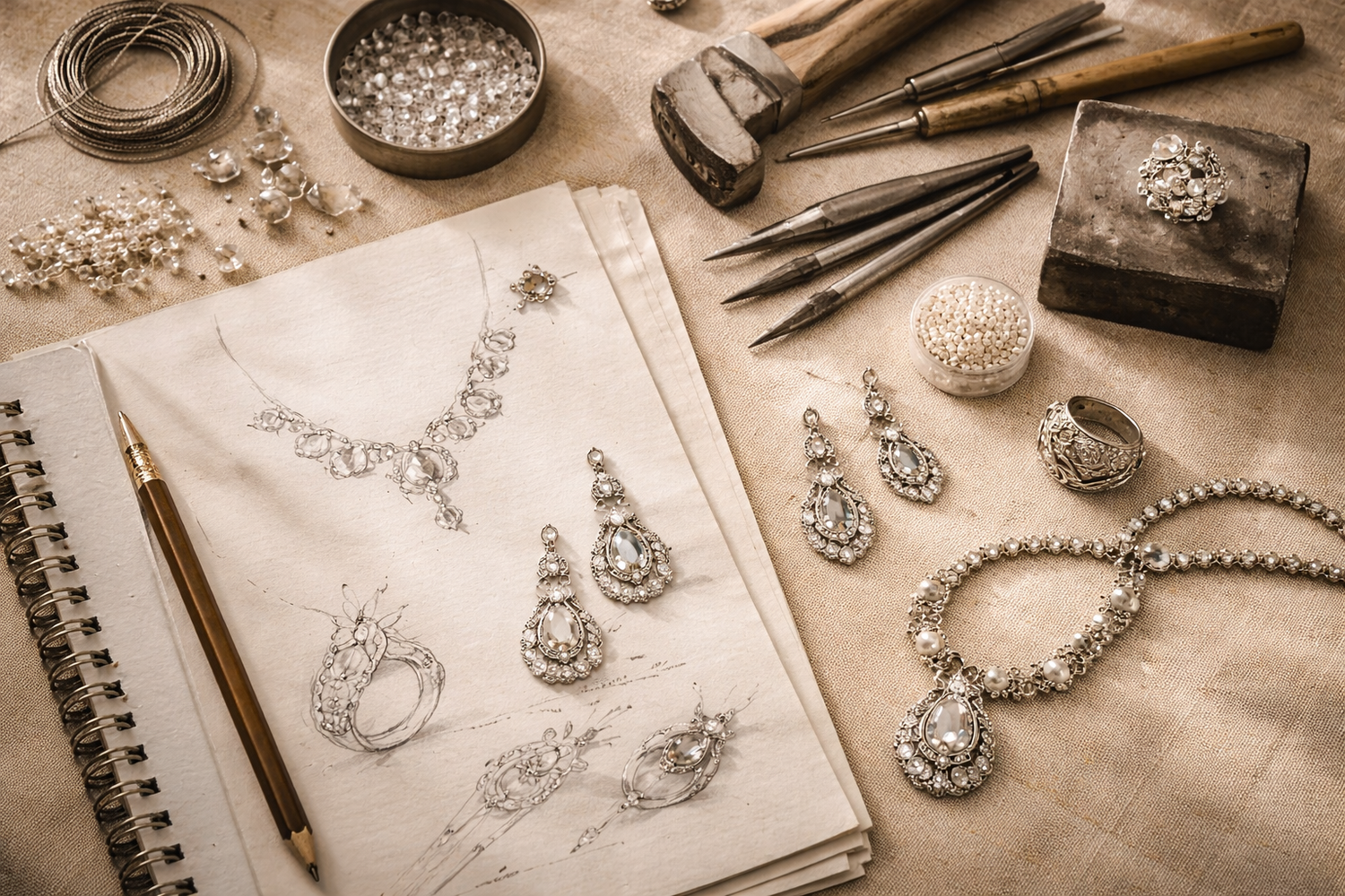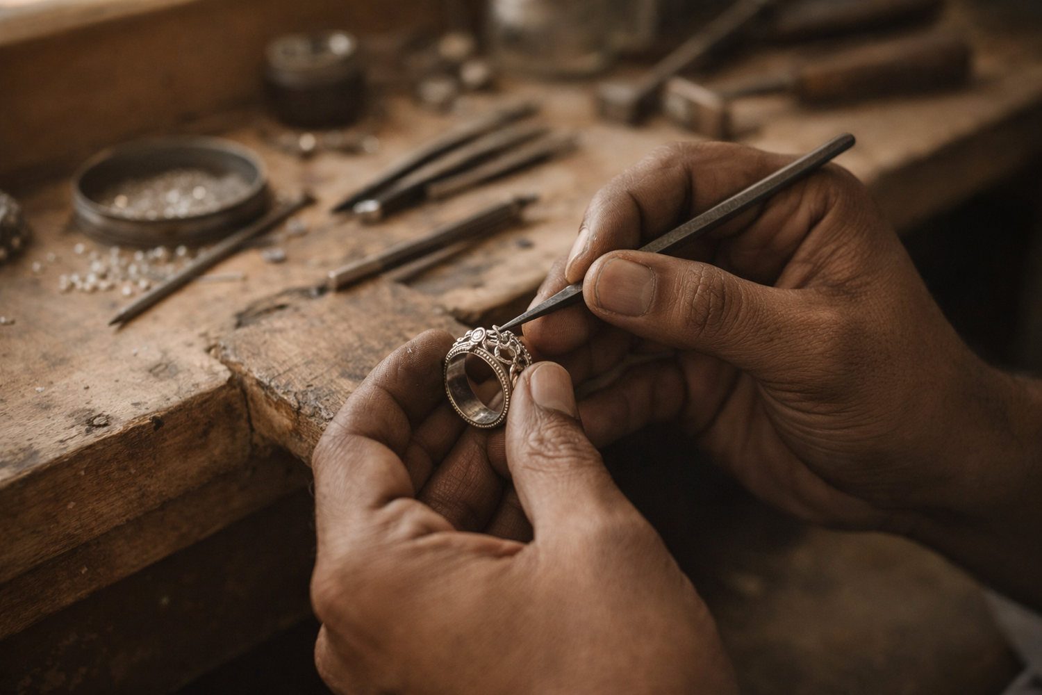 Each piece passes from the careful hands of one artisan to another, destined to be cherished across generations. In a delicate dialogue between creativity and craftsmanship, the brilliance of 925 sterling silver, gold plating, moissanite polkis, and carefully selected imitation gemstones comes alive. From the first sketch to the final casting, every step reflects meticulous attention to detail, thoughtful design, and skill — all guided by the warmth and precision of human touch.
