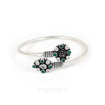 A refined expression of regal charm and timeless elegance, the Grace Emerald Flexi Bangle is inspired by classic Indian floral artistry. Featuring a graceful open-cuff silhouette, this bangle is adorned with twin floral-inspired accents set with deep emerald-green stones and luminous clear stones, framed by intricate oxidized silver detailing that enhances its royal appeal.