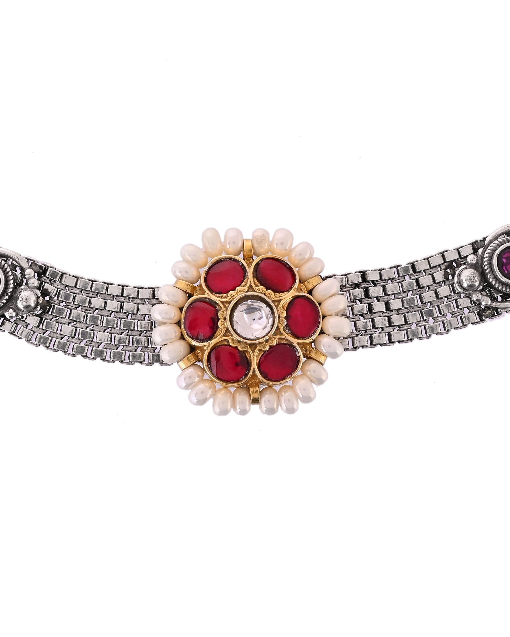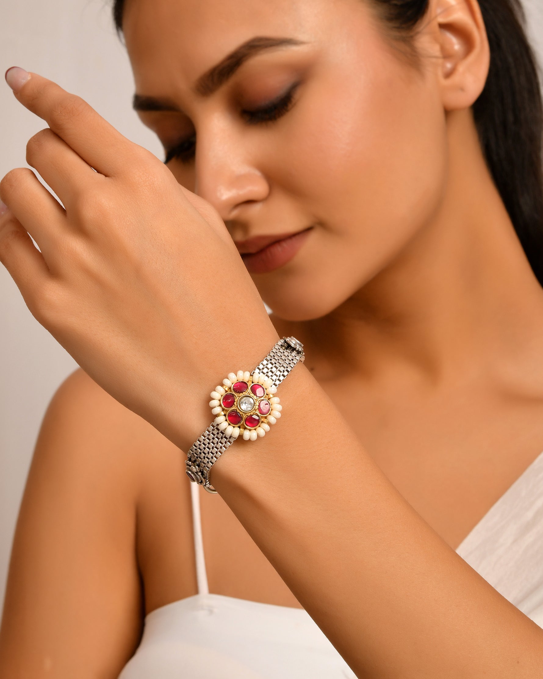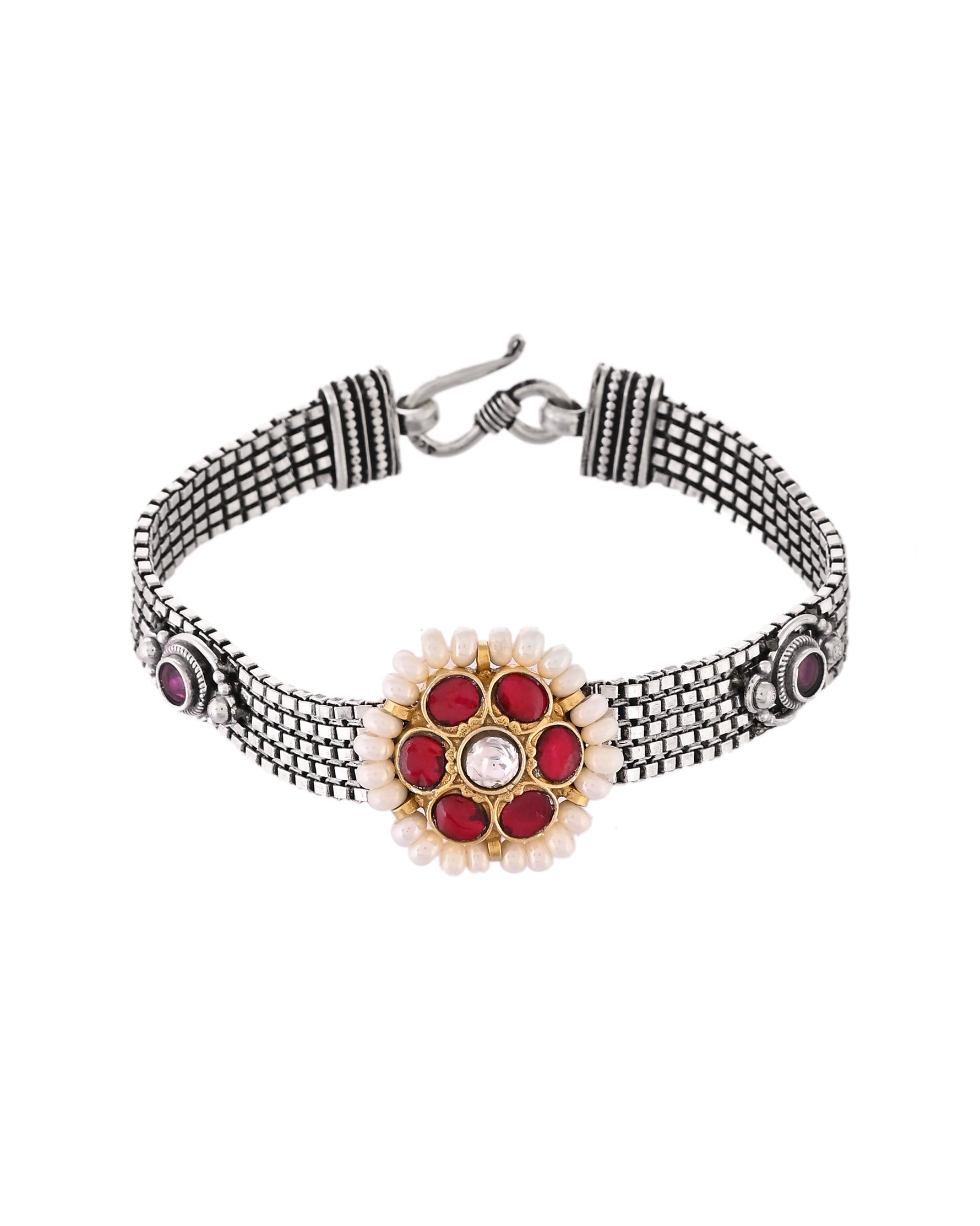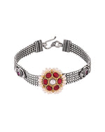This oxidized silver bracelet features a woven mesh band and is adorned with a vibrant red kundan floral centerpiece framed by delicate pearls—blending bold tradition and festive elegance in one standout piece.