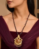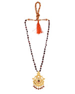 Stunning long necklace with an ornate Ganpati pendant, ruby-hued beadwork, and signature gold-tone Rajwada craftsmanship—accented with bird motifs, filigree, and meenakari enamel. This design perfectly fuses royal tradition with contemporary flair, making it a show-stopper for weddings, festive occasions, or statement ethnic styling.