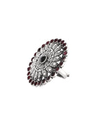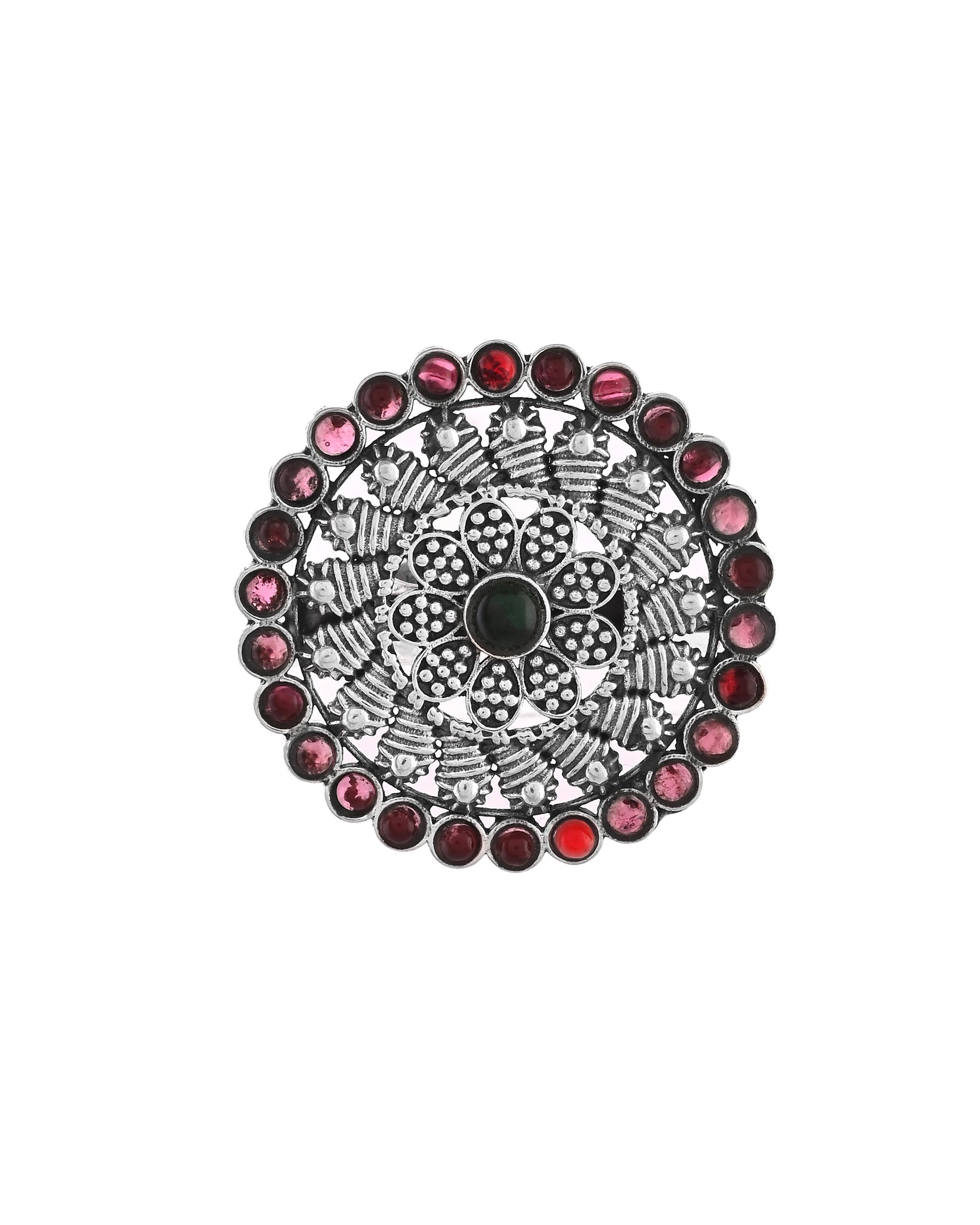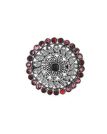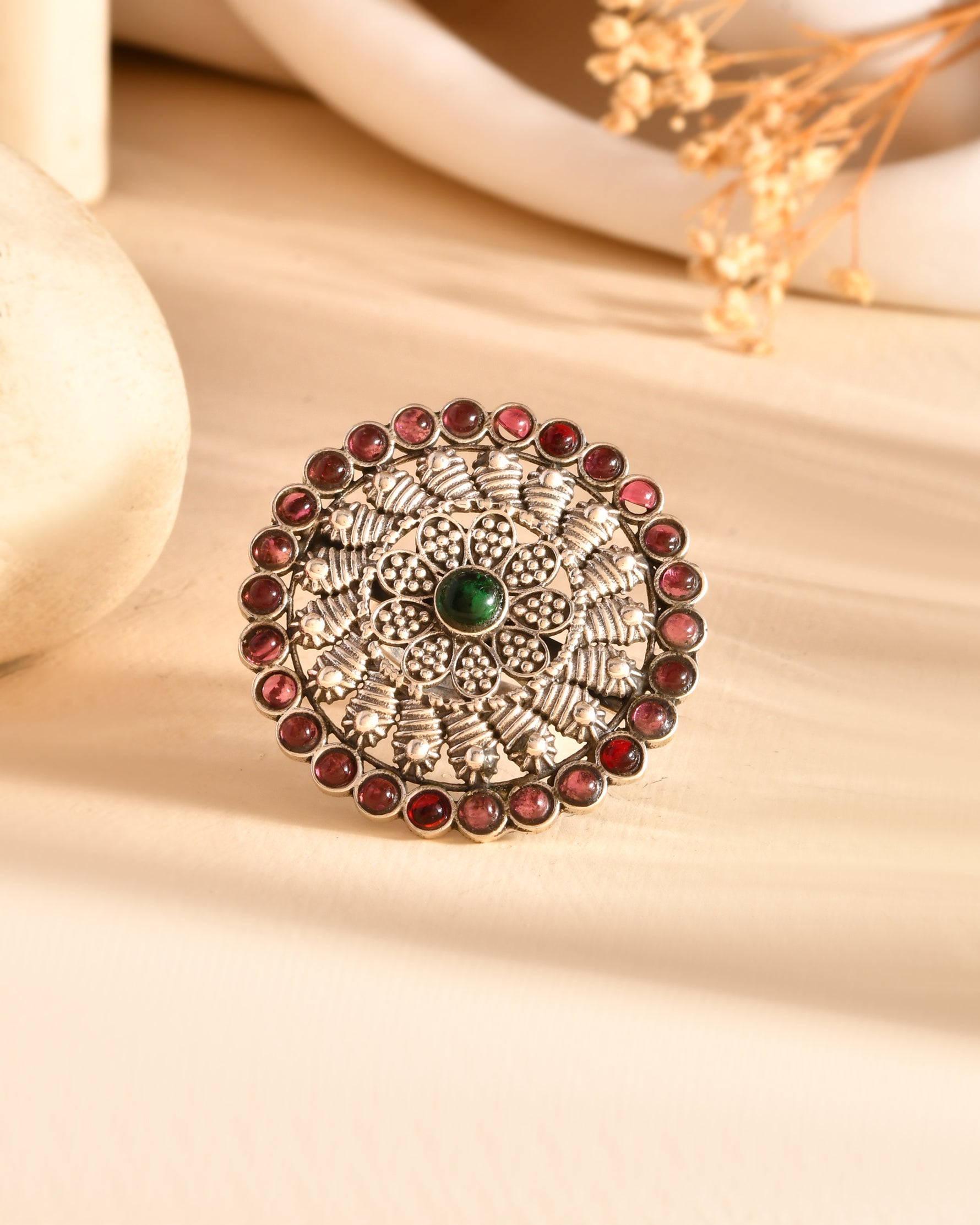 Turn up the drama with this oxidized silver statement ring! Red stones swirl around intricate filigree and a green centerpiece, making every hand-gesture bold, festive, and unforgettable