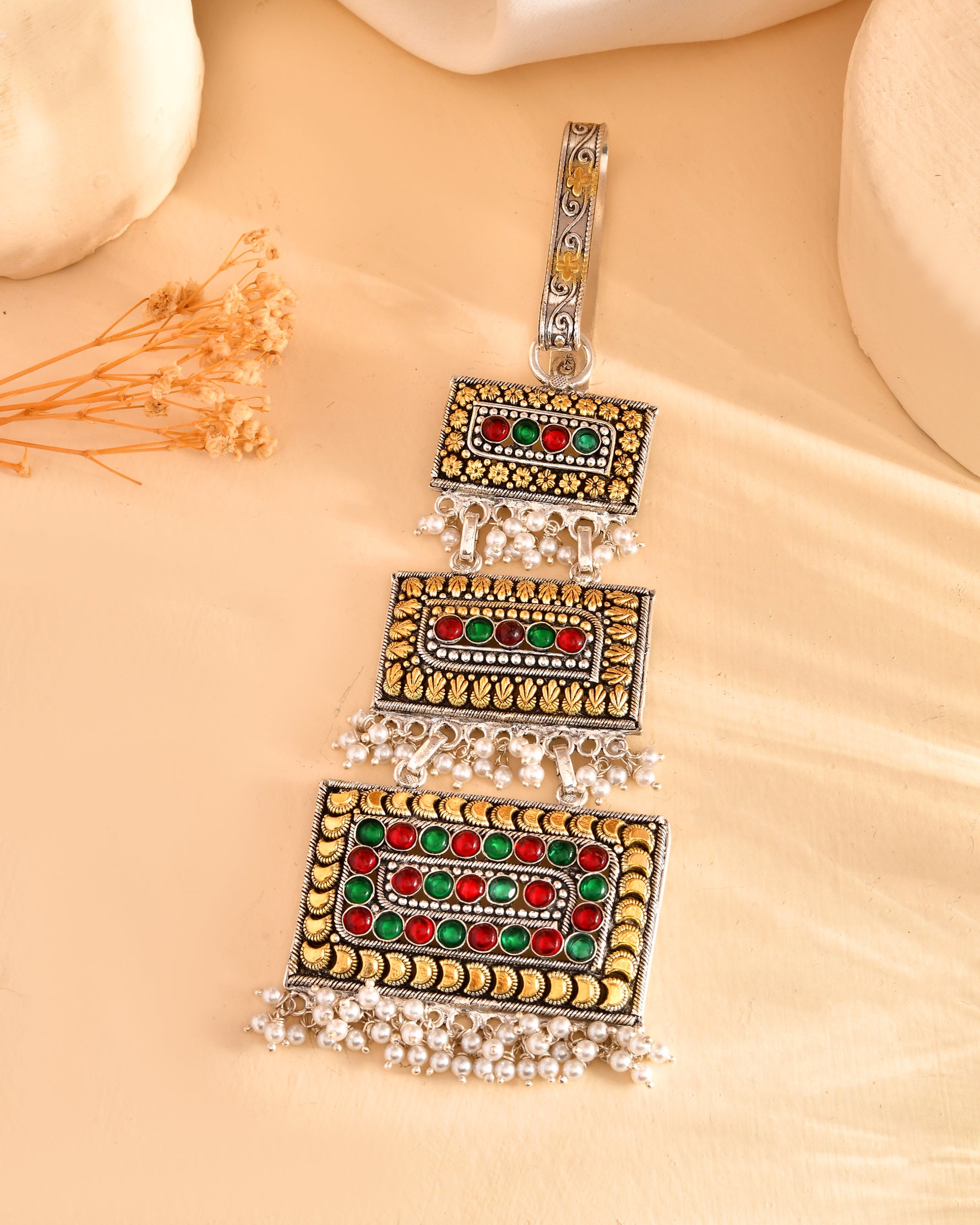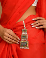 Add bright personality to a saree with this quirky satka! Three rectangular blocks of oxidized bling, red-green stones, and pearl fringe—because a little extra drama never hurt any desi fashionista.