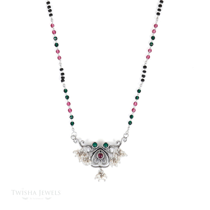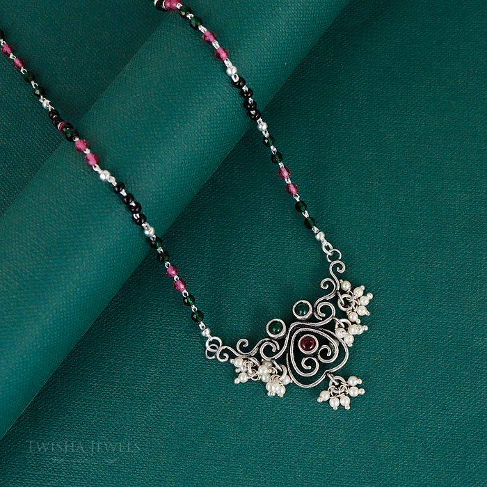 Crafted in 92.5 silver and handcrafted by skilled Indian artisans, this piece reflects timeless craftsmanship with a refined, vintage soul. The oxidized detailing enhances the intricate motifs, while the contrasting beads lend subtle brilliance.