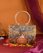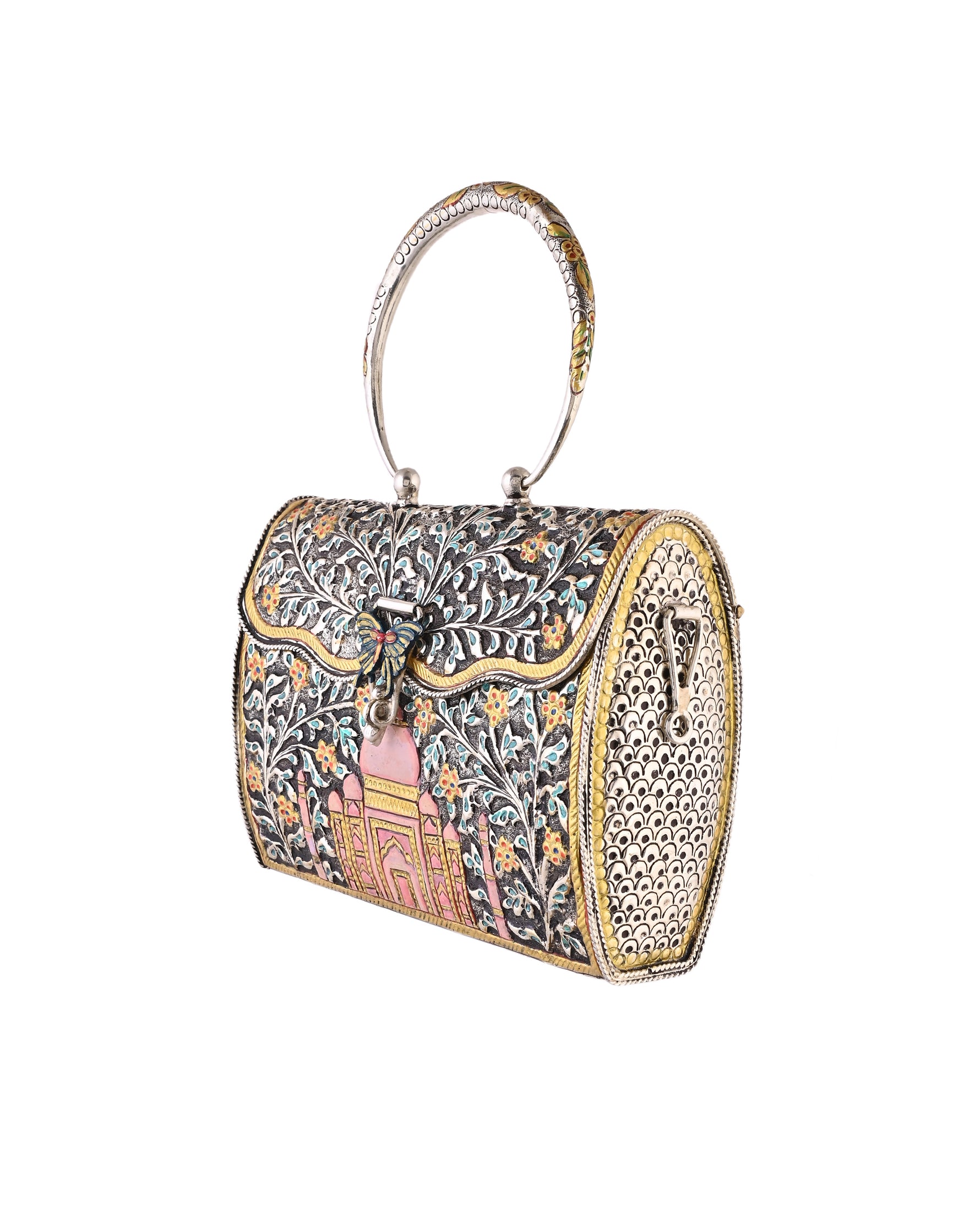 This clutch bag dazzles with oxidized silver and gold filigree, intricate floral patterns, and a hand-enameled Taj Mahal motif. Its royal ring handle and vibrant craftsmanship blend Mughal grandeur and artisanal tradition—perfect for ethnic or statement occasions.