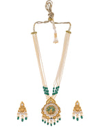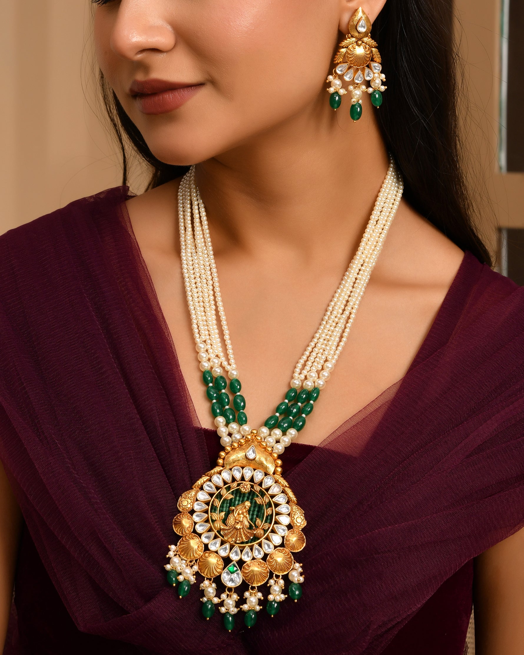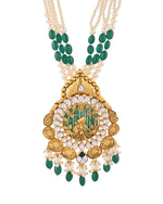 An exquisite multi-layered pearl mala necklace, featuring a regal goddess motif pendant surrounded by kundan stones, lush green beads, and ornate gold detailing. Perfect for bridal and festive looks, this statement piece blends royal Rajwada elegance with timeless tradition