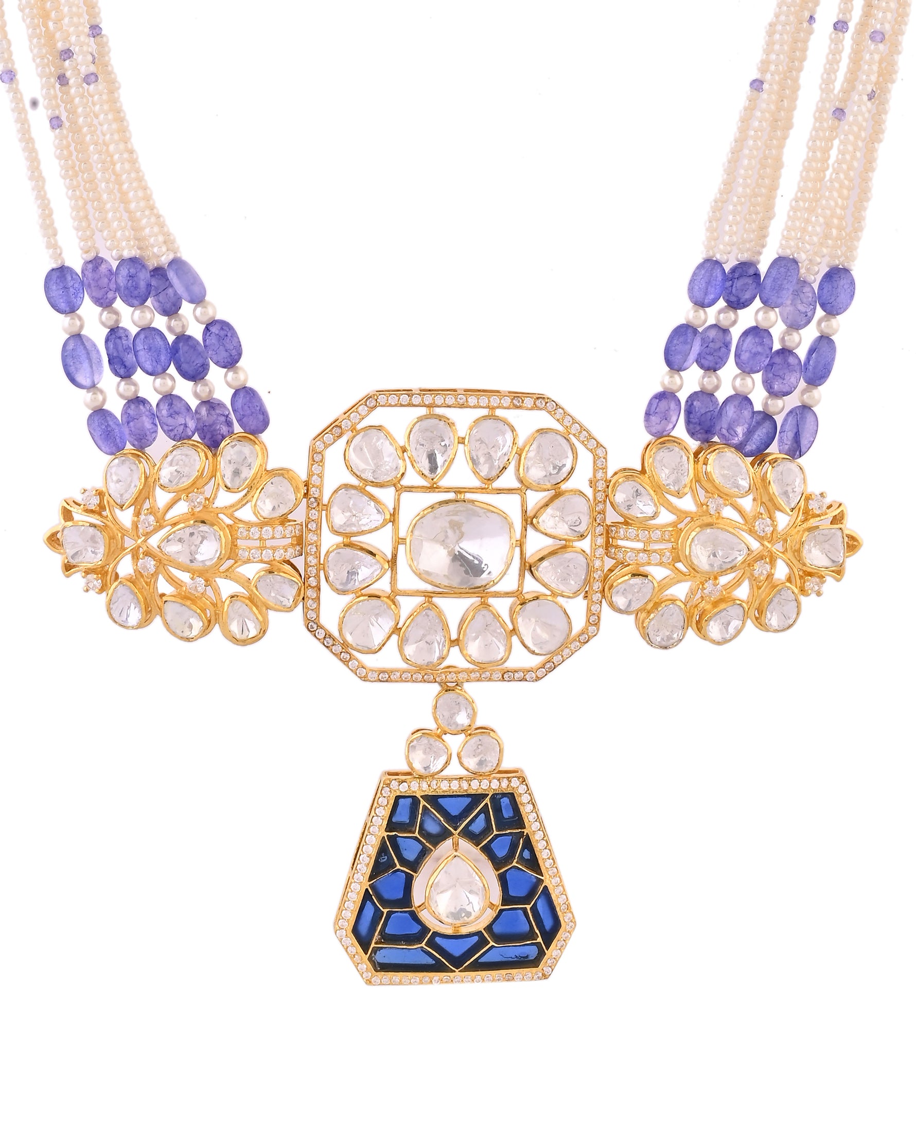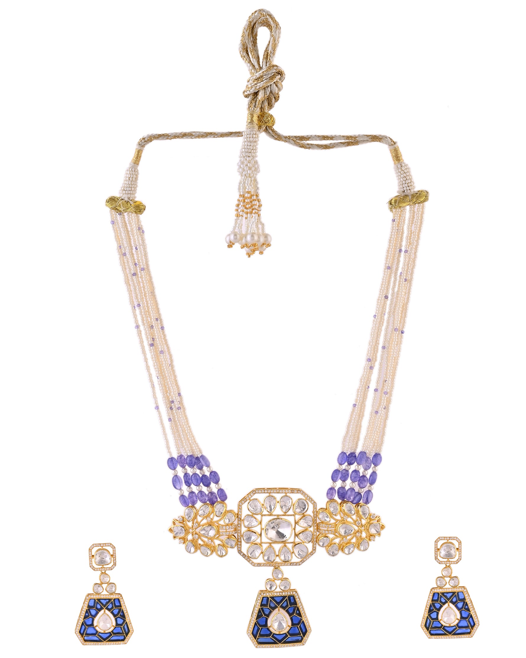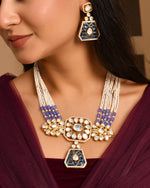 A breathtaking multi-strand necklace set featuring luminous pearl and blue beads, royal blue enamel panels, and sparkling kundan stones—crafted for modern brides and festive occasions to radiate timeless regal elegance.