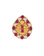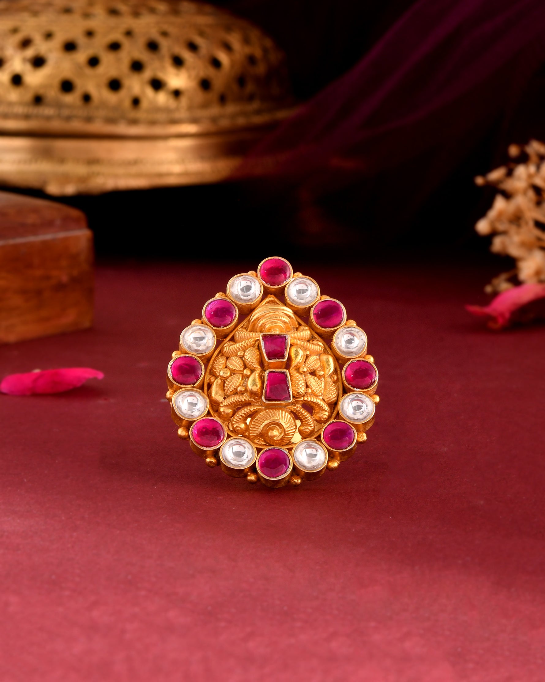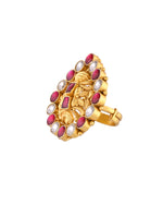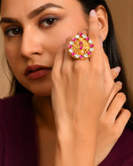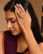 Make a playful royal statement with this bold gold ring! Embellished with sparkling pink and white stones in a sunburst pattern, it delivers glam drama for festive days, parties, and high-fashion moments